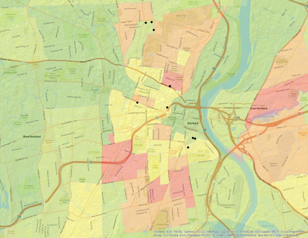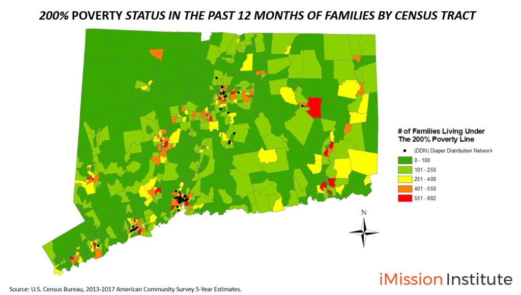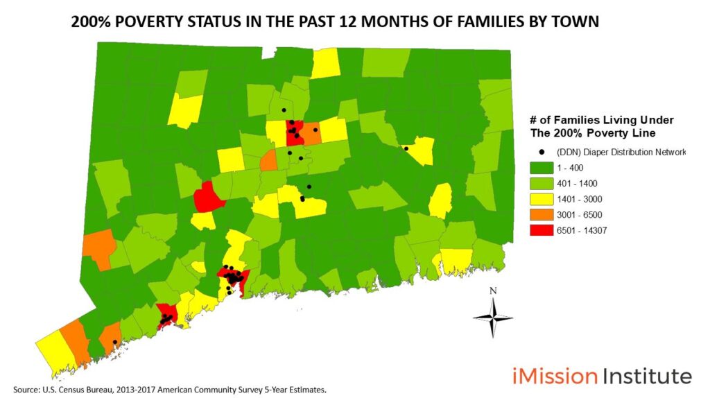 This map shows an in-depth look at the number of families living under the 200% poverty line by Census Tract within Connecticut. This scale is important to have a more targeted approach. We can now target the neighborhood level. The Diaper Bank of Connecticut can more effectively identify distribution partners near the clusters of diaper needs.